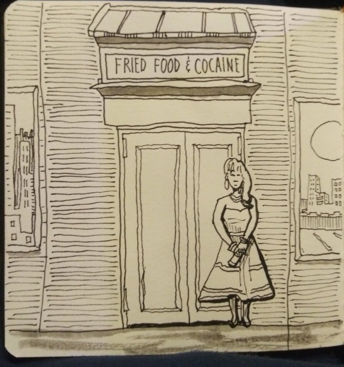 Inktober Day 7. Feels good. She’s holding spray paint and we might find out why tomorrow. Magpie Thief and Renee is a Zombie met a man on tour once who told us that he almost died, he had a heart attack from too much fried food and cocaine. Here he is in one of Renee’s tour videos: https://youtu.be/P52dxRV3M3g